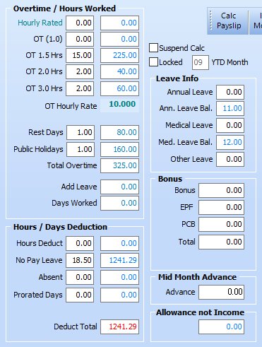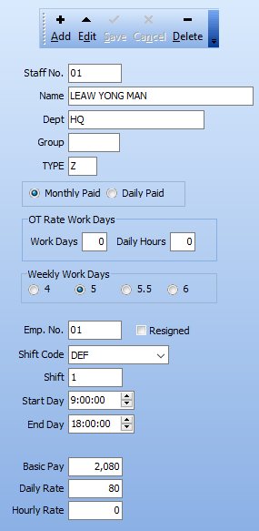 There is a field “Emp. No” that can be used to connect with the Staff No. used in your Payroll software. By default Emp. No. is same as Staff No.