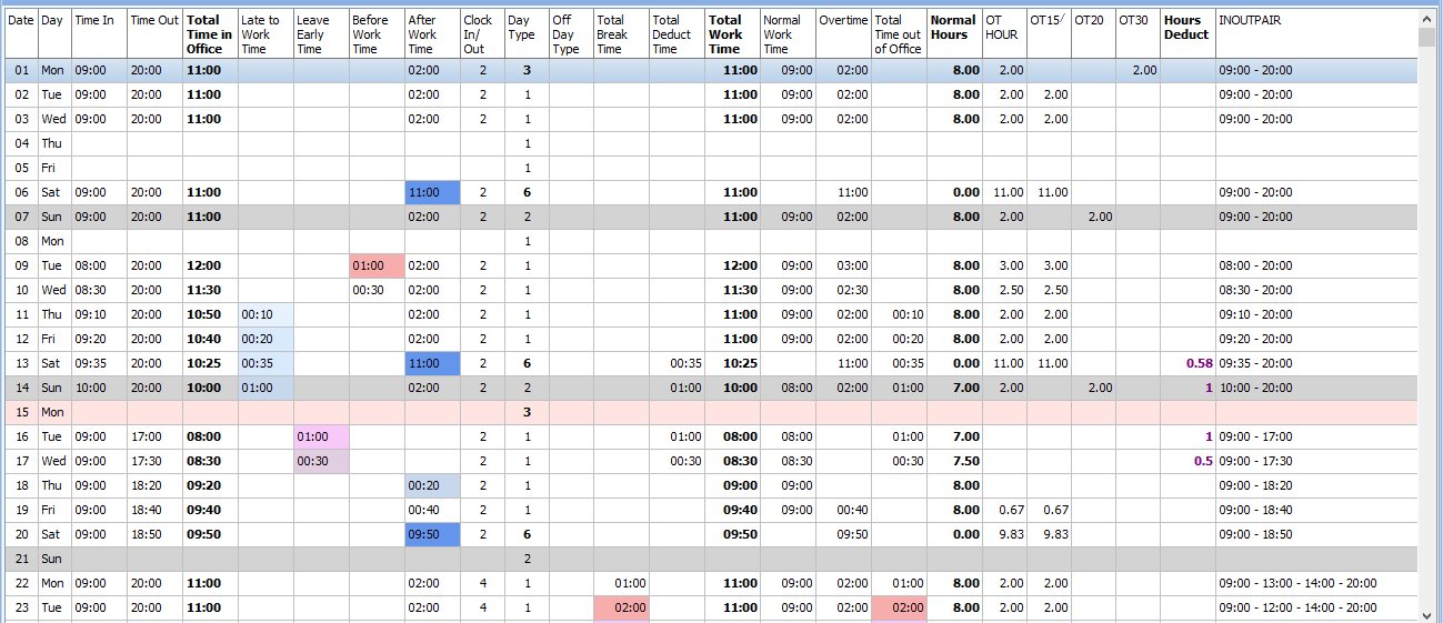 Actime supports multiple time attendance formats. The most popular format is the following :