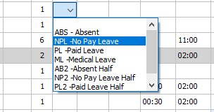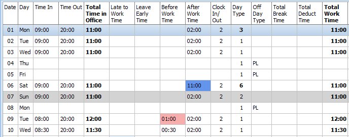 Leave Early Time Time left work early. Color will get darker depending on how early. Default early time to track can be set.