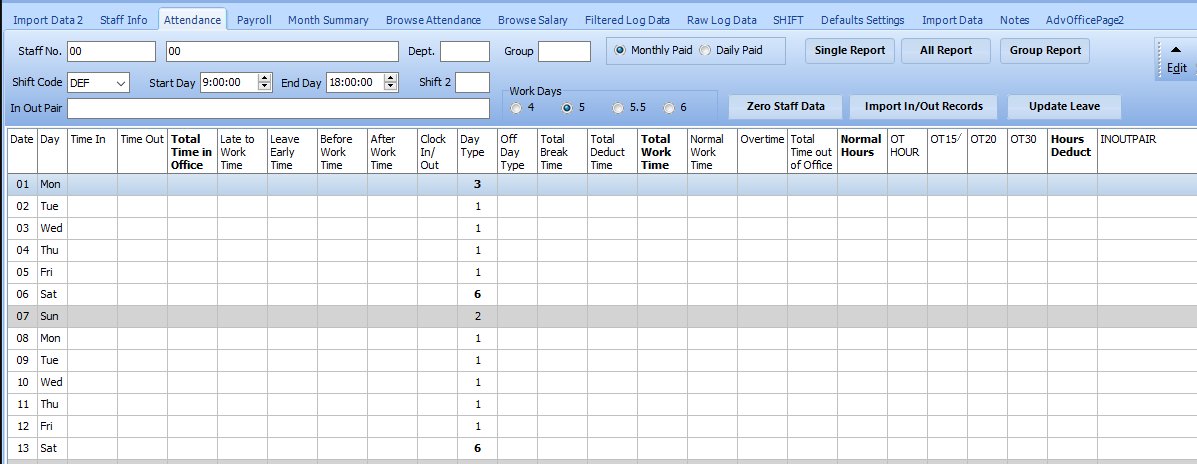 Note: It also sets Holiday information. Day Type = ‘3’ is holiday. Further sets Rest Day = ‘2’ and Saturday = ‘6’. These values are needed to calculate overtime for 5 day week or 6 day week.